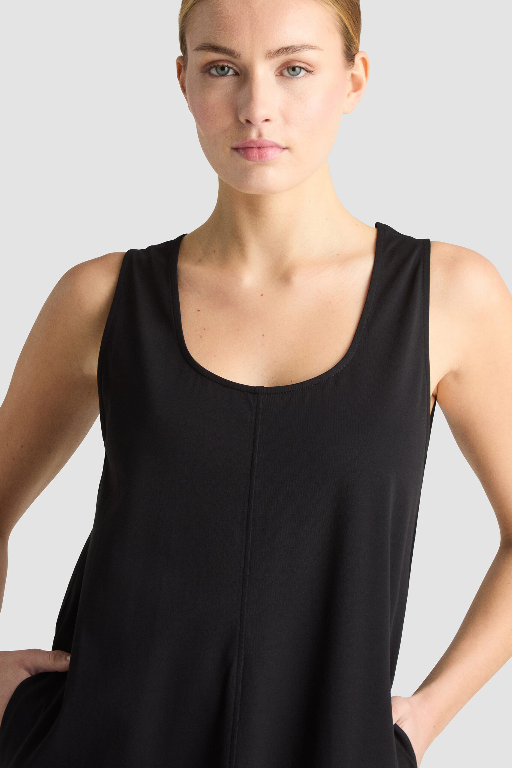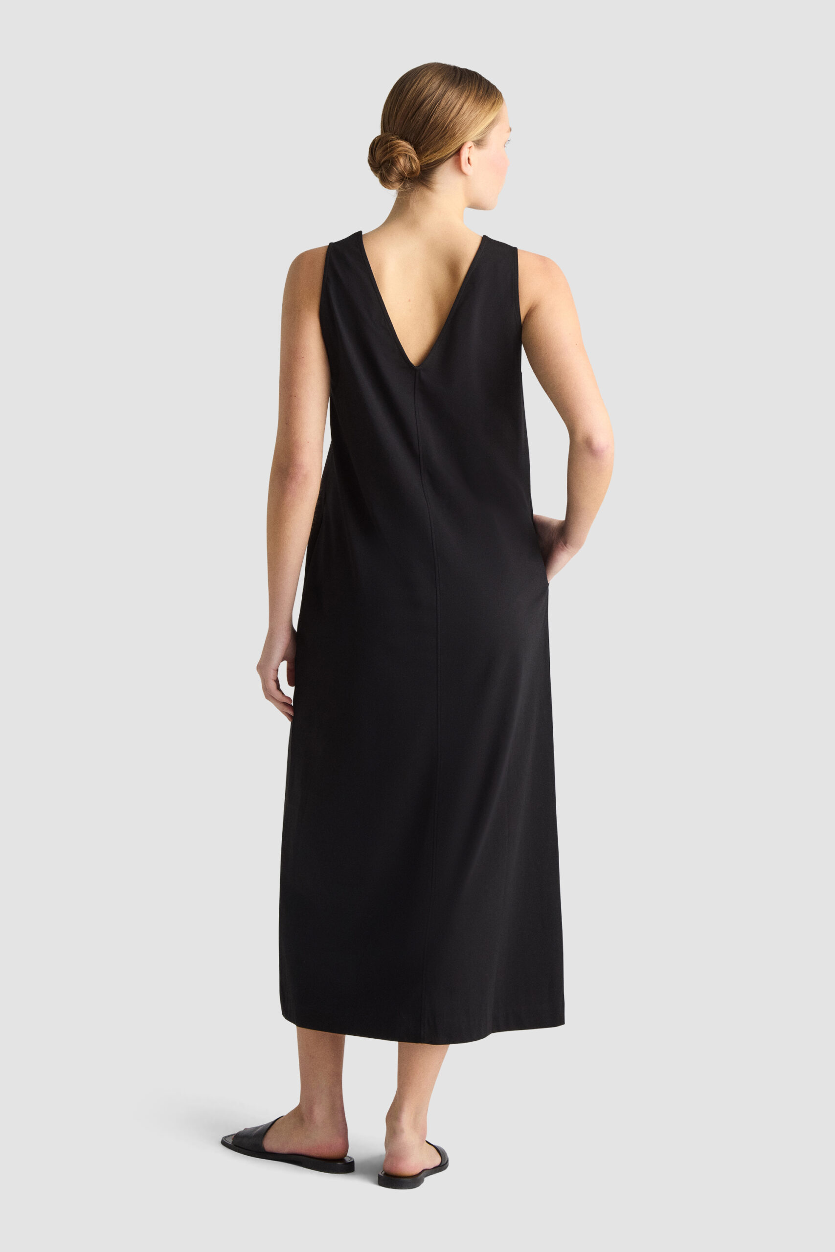 • Berta Dress is a relaxed dress with a round neckline at the front and a V-neck at the back. It has a relaxed A-line fit that falls to mid-calf and features side seam pockets.